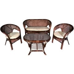 Комплект мебели для террасы 02/15 включает в себя: 2 кресла, плетеный двухместный диван, столик журнальный, подушки из материала улучшенного качества.